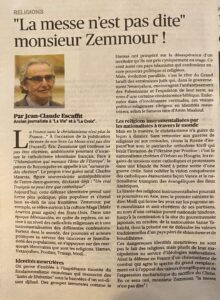A l’occasion de la publication de son livre La Messe n’est pas dite, Éric Zemmour qui confesse ne pas être chrétien, ambitionne pourtant d’incarner le catholicisme identitaire en France.