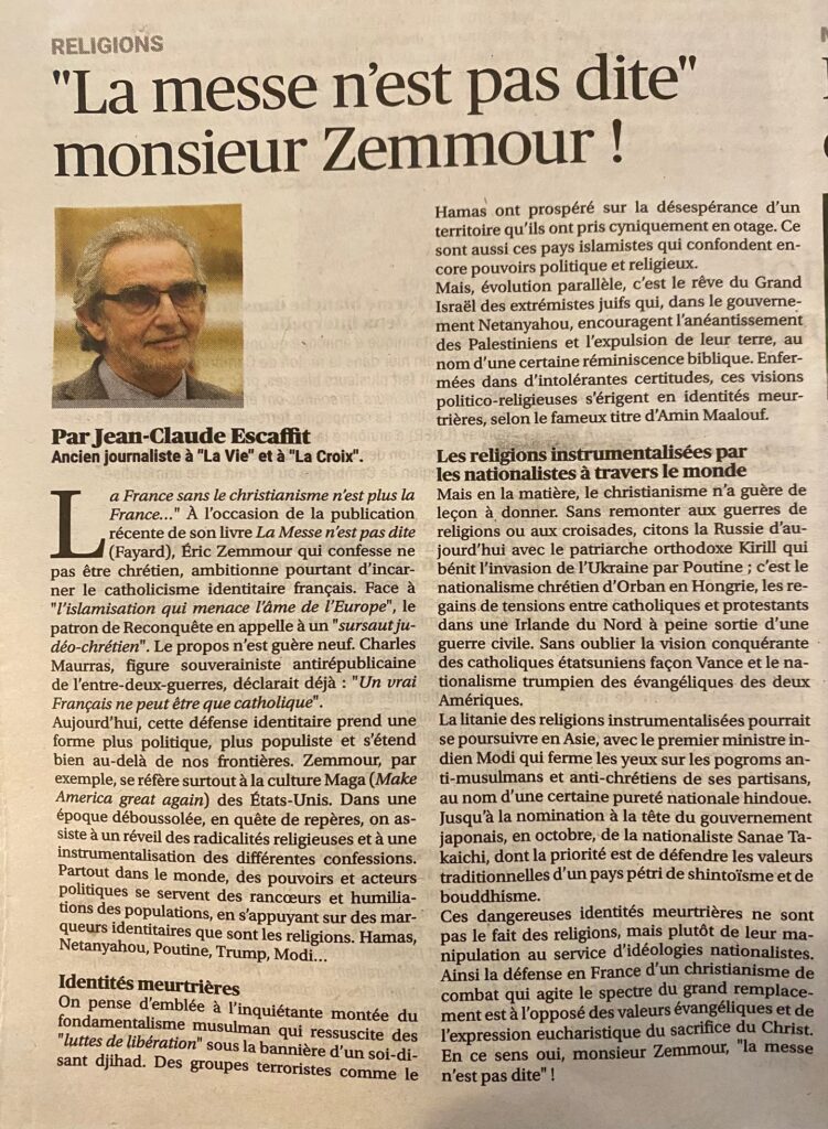 Ces dangereuses identités meurtrières ne sont pas le fait des religions, mais de leur manipulation au service d’idéologies nationalistes. Ainsi la défense en France d’un christianisme de combat qui agite le spectre du grand remplacement est à l’opposé des valeurs évangéliques et de l’expression eucharistique du sacrifice du Christ. En ce sens oui, Monsieur Zemmour, « la messe n’est pas dite » !